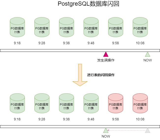 如下图所示,假设有一个SQL在9:58时,因为WHERE条件写错了导致错误的修改了部分业务数据,DBA在10:08分的时候发现了这个问题,这时可以使用闪回插件,将数据库临时闪回到9:58分,找回正确的业务数据。