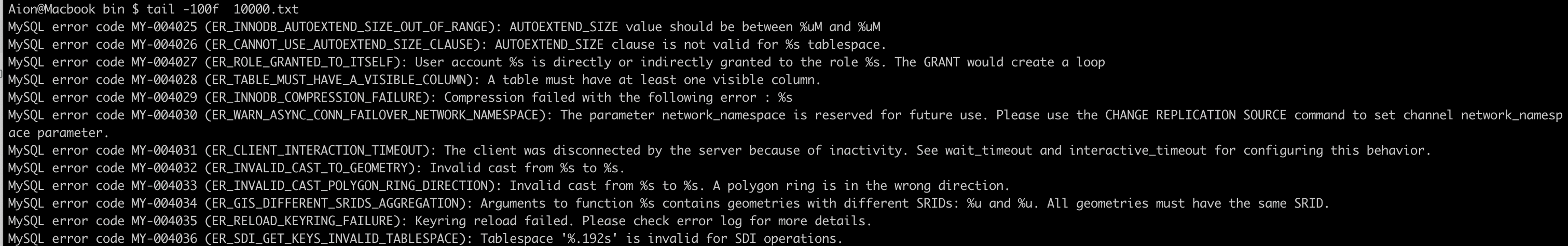 对于使用格式,perror试图灵活理解其参数,例如,对于ER_WRONG_VALUE_FOR_VAR错误,perror理解这些参数中的任何一个:1231、001231、MY-1231或MY-001231,或ER_WRONG_VALUE_FOR_VAR。说到这里,其实这里好像是一个模糊的准确定位,你可以输入上述任何一种来展示错误的详细信息,以帮助理解当前机器或程序出现的问题。