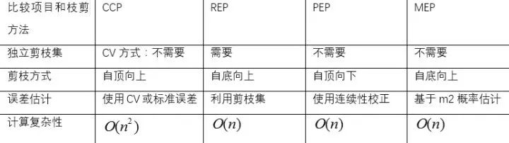 CPC:CCP算法为子树定义了代价和复杂度,以及一个衡量代价与复杂度之间关系的参数。代价指的是在剪枝过程中因子树被叶节点替代而增加的错分样本;复杂度表示剪枝后子树减少的叶结点数; 从下到上计算每一个非叶节点的α值,然后每一次都剪掉具有最小值的子树,最后得到,其中是完整的数,表示根节点,然后根据真实的错误率在中选择一个最好的。