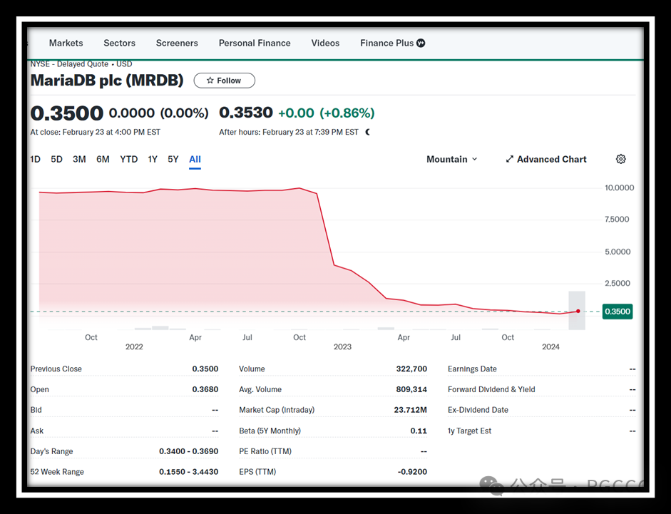 尽管MariaDB在技术上有着明显优势,但其财务状况却并不乐观。财务困境、市值下滑以及业务转型困难成为了其面临的主要挑战。云计算的快速发展使得数据库市场更加竞争激烈,MariaDB在云数据库服务领域面临着诸多挑战。MariaDB 市值自 2022 年底 4.45 亿美元的首日峰值之后一路下跌(而且这个数字已经远低于 MariaDB 上市前 D 轮融资中的 6.72 亿美元估值)。经过一年多的持续缩水,今年年初以来 MariaDB 的市值开始稳定维持在 1000 万美元出头。