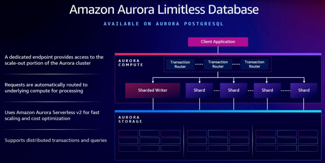 2023 年AWS re:Invent 上宣布推出Aurora Limitless Database,本质上是存算分离的 Aurora 的基础上加了一层 proxy 做分布式。下图就是 AWS 的架构: