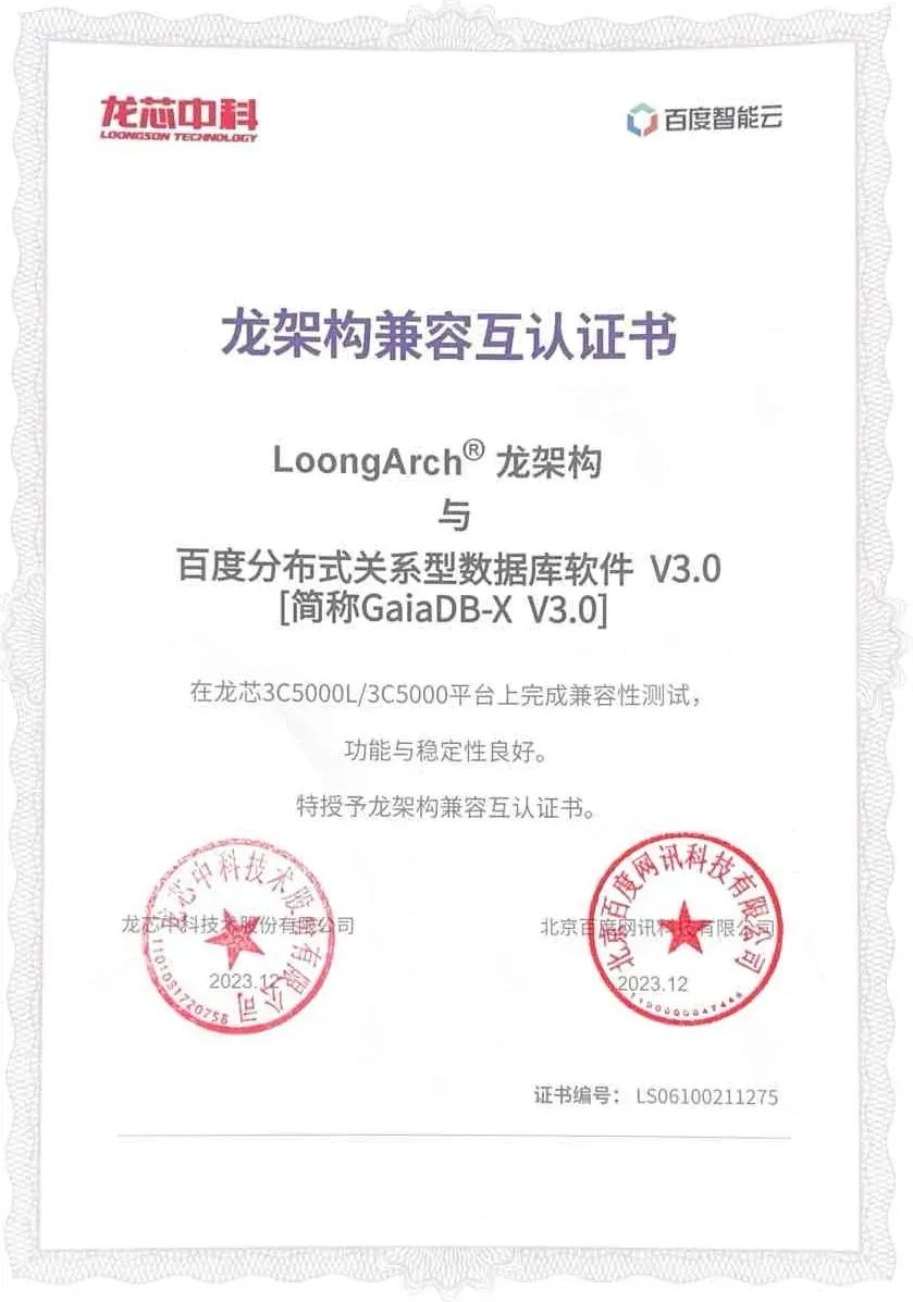 近日,百度智能云的分布式关系型数据库软件 GaiaDB-X V3.0 与龙芯中科技术股份有限公司的龙芯 3C5000L/3C5000 处理器平台完成兼容性测试,功能与稳定性良好,获得了龙架构兼容互认证证书。