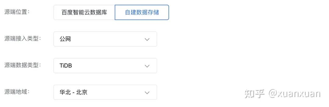 首先,在创建任务界面配置数据传输任务的部分上下游连接信息,创建任务时支持源端/目标端位置选择自建数据存储和百度智能云数据库。