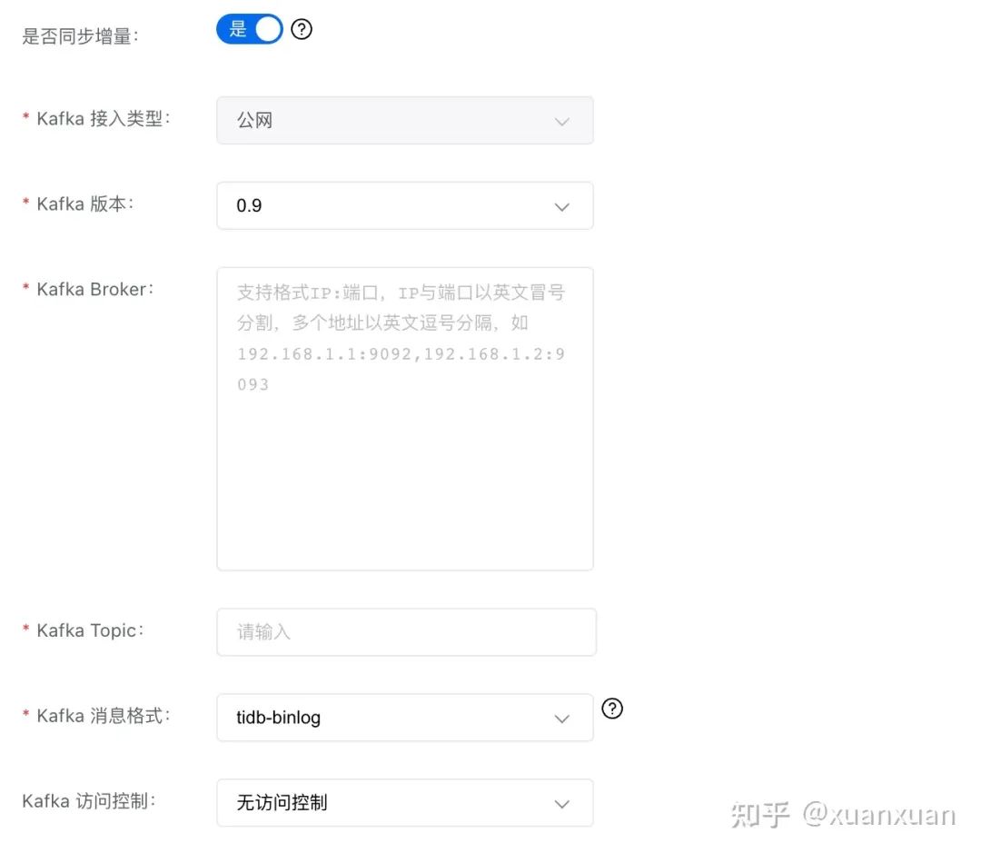 是否同步增量:若需要做增量同步,需要开启此选项,开启后需要填写 Kafka 连接信息,如下所示: