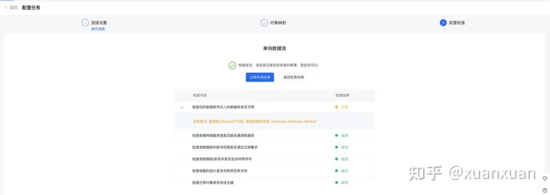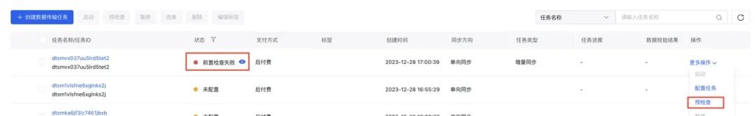 若出现检查失败,您可以修改任务配置后重新执行预检查,或返回列表页后重新执行预检查。