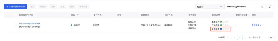 在列表页观察到正向数据流进入复制变更阶段,且延迟追平。