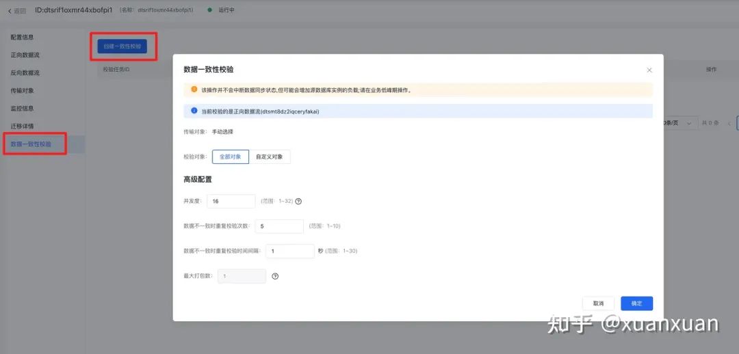 可以点击任务 ID 进入任务详情页。选择右侧数据一致性校验,点击【创建一致性校验】按钮后,可根据需要调整数据校验配置。完成后点击【确定】按钮,启动数据校验。