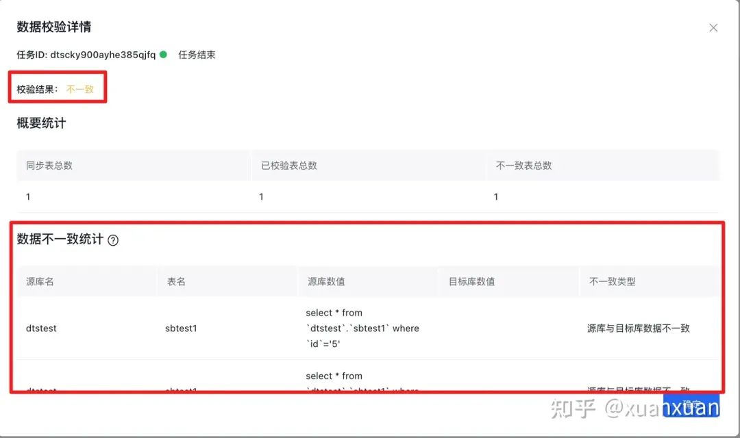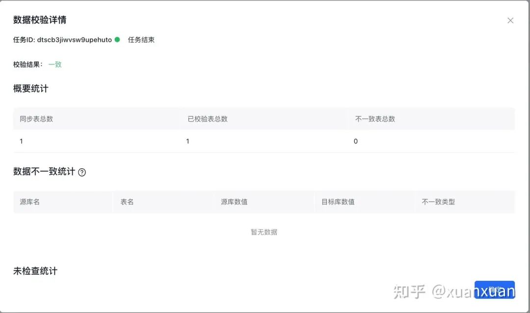 执行完成的数据校验任务状态为任务结束,您可以点击【查看详情】查看数据校验详情,可以看到校验结果和数据不一致统计。对校验结果的详细解释可见:创建数据校验任务