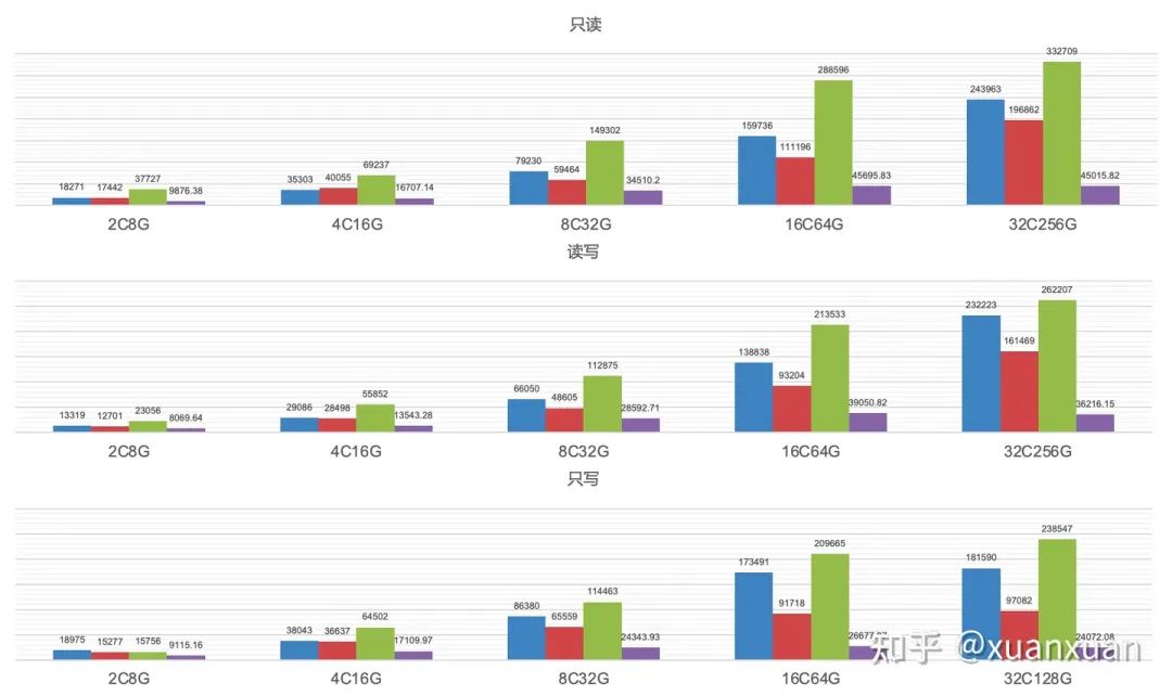 不同厂商的数据库实例的默认参数也各有不同,因此不能确定测试结果是最优配置,但基本是默认配置下的性能表现。