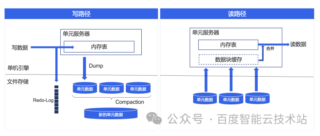 NoSQL 伴随着互联网业务发展而来,生来就是为了解决关系型数据库在垂直场景的不足。因此对于 NoSQL 数据库来说,高性能、低成本、高可用、高扩展是其核心能力。接下来会重点介绍 BTS 是如何实现这些能力的。在这之前先介绍下单机引擎的读写路径,这是性能优化和高可用实现的前提。首先是写路径,客户端写入数据后,数据写入 Redo-Log 并写进内存表中,导出数据压缩后以单元数据模式存储,可以支持多级压缩。详细的路径是:客户端写->数据写 Redo-Log->进入内存表-> dump 数据。压缩后以单元数据模式存储,支持多级压缩。读路径则和写路径刚好相反:客户端读->优先在数据块缓存查询(如有)->如未命中,下沉到单元数据中查询->将数据返回客户端。读取数据的时候,核心能力是利用数据缓存加上内存里面的数据进行合并,加快读数据。