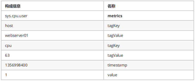 Series包含一个Metric名称,但可能包含包含1组或多组Tags信息(每一个Tag包含一个TagKey与TagValue),以前面的"webserver01.sys.cpu.0.user"为例,在OpenTSDB表示为: