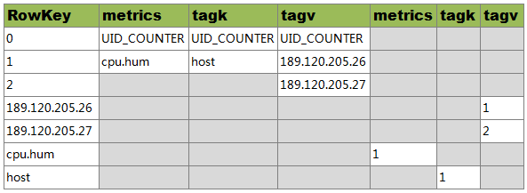 RowKey为"189.120.205.26"的行中,Qualifer为"name:tagv"的值为UID。表示当"189.120.205.26"为tagValue时,其UID为1