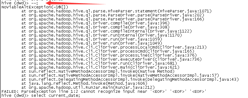 NoViableAltException(-1@[]) at org.apache.hadoop.hive.ql.parse.HiveParser_SelectClauseParser.selectClause(HiveParser_SelectClauseParser.java:1087) at org.apache.hadoop.hive.ql.parse.HiveParser.selectClause(HiveParser.java:45827) at org.apache.hadoop.hive.ql.parse.HiveParser.selectStatement(HiveParser.java:41495) at org.apache.hadoop.hive.ql.parse.HiveParser.regularBody(HiveParser.java:41402) at org.apache.hadoop.hive.ql.parse.HiveParser.queryStatementExpressionBody(HiveParser.java:40413) at org.apache.hadoop.hive.ql.parse.HiveParser.queryStatementExpression(HiveParser.java:40283) at org.apache.hadoop.hive.ql.parse.HiveParser.execStatement(HiveParser.java:1590) at org.apache.hadoop.hive.ql.parse.HiveParser.statement(HiveParser.java:1109) at org.apache.hadoop.hive.ql.parse.ParseDriver.parse(ParseDriver.java:202) at org.apache.hadoop.hive.ql.parse.ParseDriver.parse(ParseDriver.java:166) at org.apache.hadoop.hive.ql.Driver.compile(Driver.java:396) at org.apache.hadoop.hive.ql.Driver.compile(Driver.java:308) at org.apache.hadoop.hive.ql.Driver.compileInternal(Driver.java:1122) at org.apache.hadoop.hive.ql.Driver.runInternal(Driver.java:1170) at org.apache.hadoop.hive.ql.Driver.run(Driver.java:1059) at org.apache.hadoop.hive.ql.Driver.run(Driver.java:1049) at org.apache.hadoop.hive.cli.CliDriver.processLocalCmd(CliDriver.java:213) at org.apache.hadoop.hive.cli.CliDriver.processCmd(CliDriver.java:165) at org.apache.hadoop.hive.cli.CliDriver.processLine(CliDriver.java:376) at org.apache.hadoop.hive.cli.CliDriver.executeDriver(CliDriver.java:736) at org.apache.hadoop.hive.cli.CliDriver.run(CliDriver.java:681) at org.apache.hadoop.hive.cli.CliDriver.main(CliDriver.java:621) at sun.reflect.NativeMethodAccessorImpl.invoke0(Native Method) at sun.reflect.NativeMethodAccessorImpl.invoke(NativeMethodAccessorImpl.java:57) at sun.reflect.DelegatingMethodAccessorImpl.invoke(DelegatingMethodAccessorImpl.java:43) at java.lang.reflect.Method.invoke(Method.java:606) at org.apache.hadoop.util.RunJar.main(RunJar.java:212) FAILED: ParseException line 1:14 cannot recognize input near '<EOF>' '<EOF>' '<EOF>' in select clause |