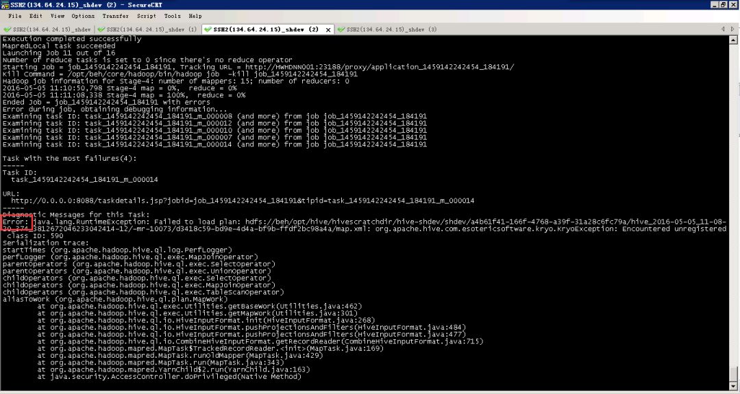 Execution failed with exit status: 3 Obtaining error information Task failed! Task ID: Stage-8 Logs: /opt/beh/logs/hive/shleader-hive.log FAILED: Execution Error, return code 3 from org.apache.hadoop.hive.ql.exec.mr.MapredLocalTask ATTEMPT: Execute BackupTask: org.apache.hadoop.hive.ql.exec.mr.MapRedTask |