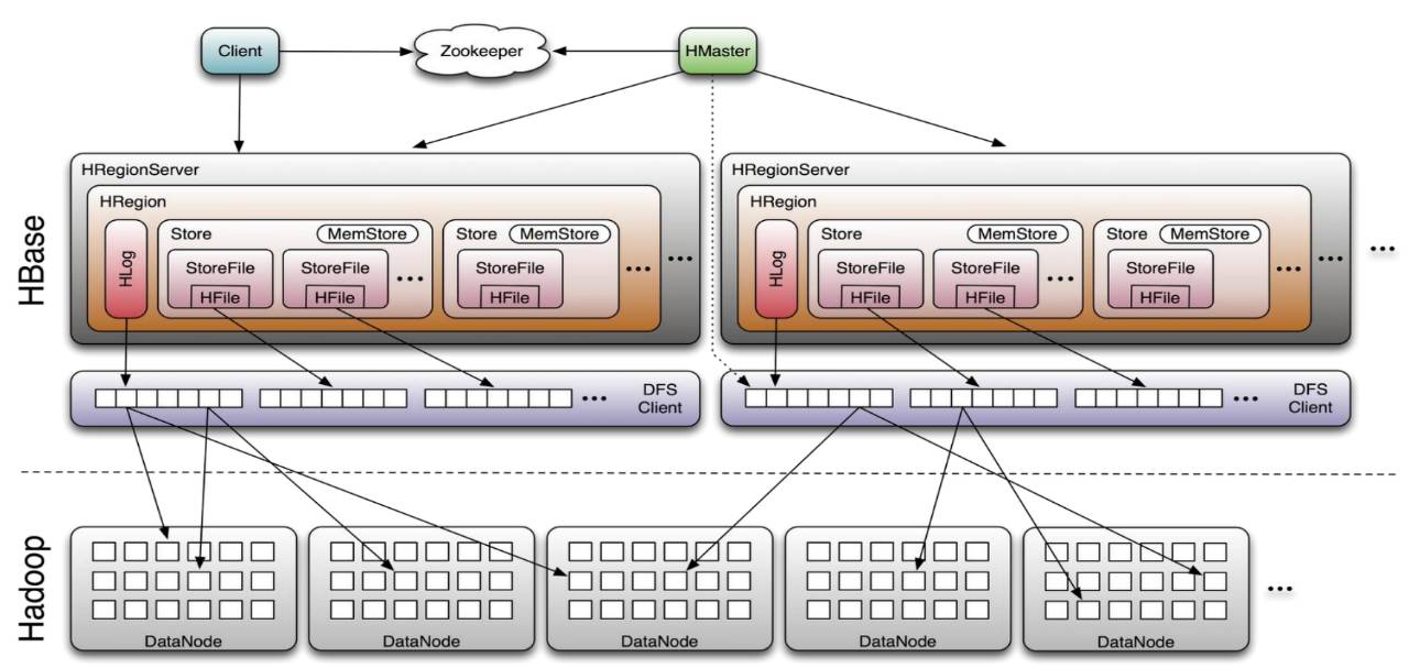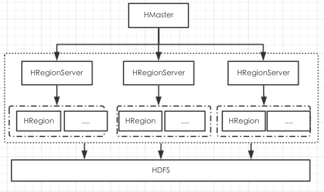 HBase是一个分布式非关系型的数据库,参考了Google的BigTable模型而实现,通过Zookeeper来管理集群(Master的选举),使用HDFS作为底层存储。在架构设计上由HMaster和多个HRegionServer组成,设计图如下: