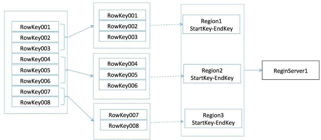1.Region负责Rowkey数据的存储,在HBase数据表中按照RowKey的范围划为一个的Region,实现分布式的存储,每一个Region都关联一个Rowkey的范围(StartKey-EndKey)(可以参考HBase细节概要篇)