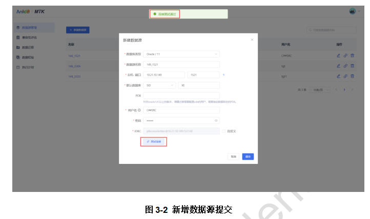 在弹出窗填入正确的数据源信息后,可以点击“测试连接”按钮对填入的数据源进行连接测试。