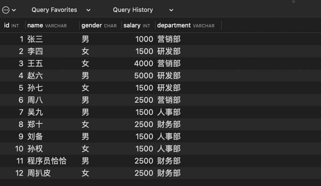 (11, '程序员恰恰', '男', 2500, '财务部'),