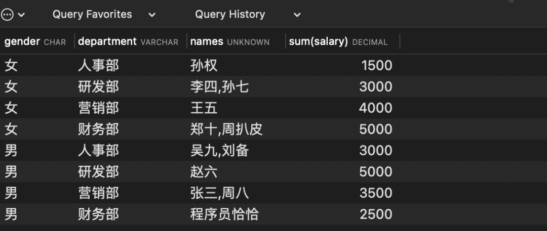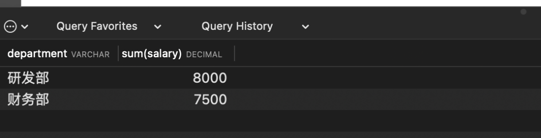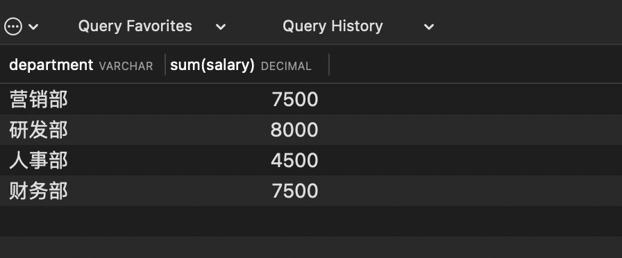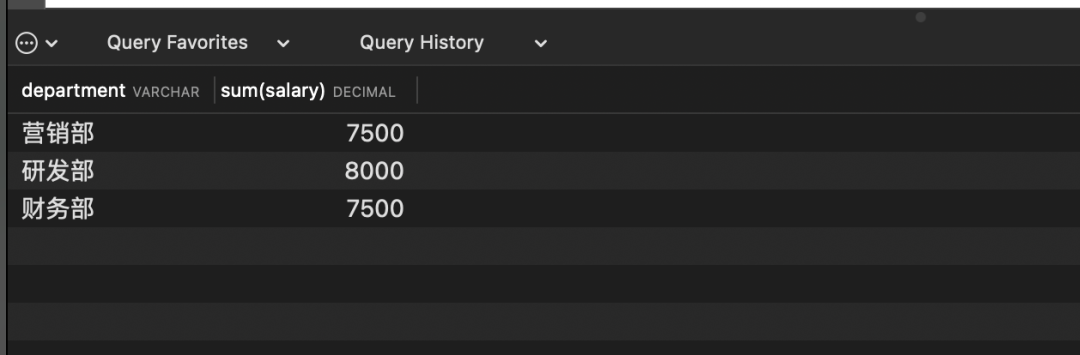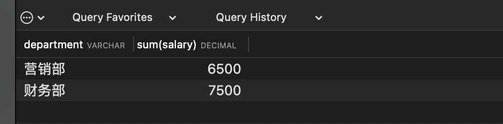 # 按照部门分组,查询非营销部且部门总工资大于5000的部门select department, sum(salary) from employee group by department