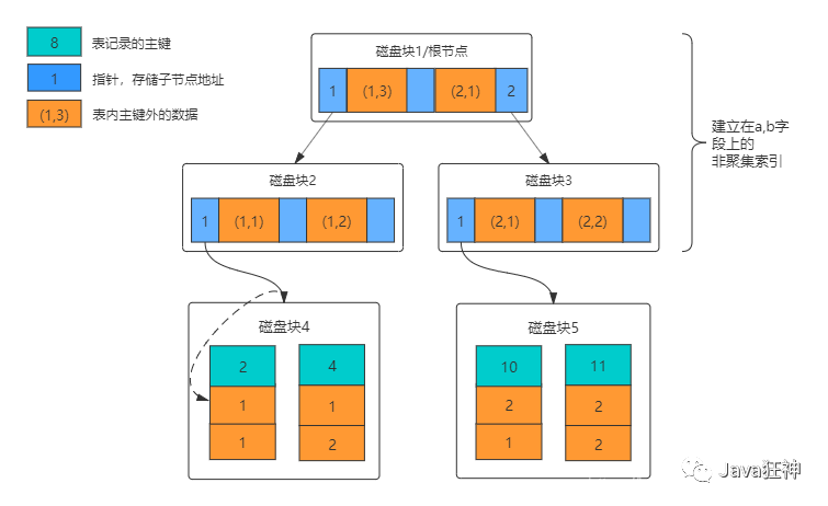 例如在a和b字段上建立联合索引,索引结构将如下图所示: