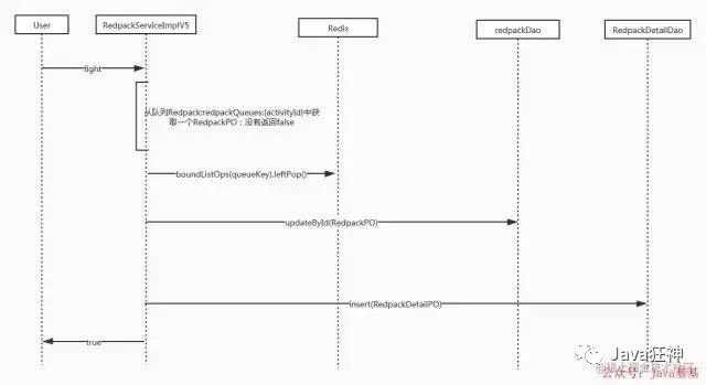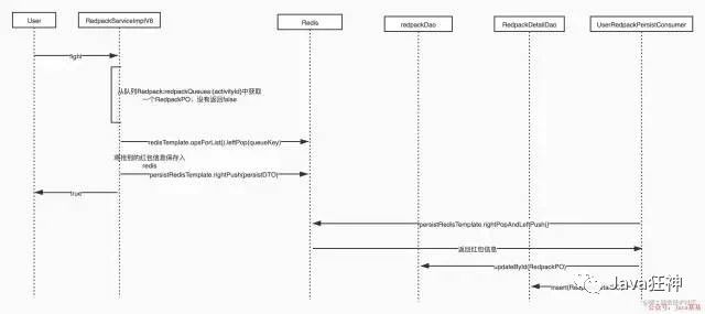 这种方案的是抢到红包后不操作数据库,而是保存持久化信息到Redis中,然后返回成功。通过另外一个线程UserRedpackPersistConsumer