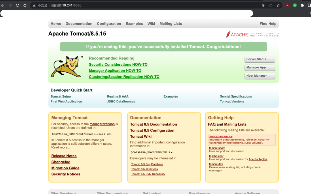 docker run -d -p 8080:8080 --name tomcat daocloud.io/library/tomcat:8.5.15-jre8