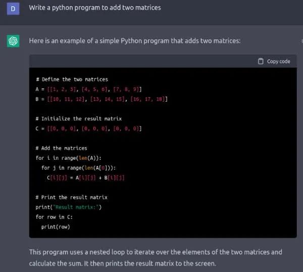 图 1 显示了 ChatGPT 编写的将两个矩阵相加的 Python 程序。我要求用 BASIC、FORTRAN、Pascal、Haskell、Lua、Pawn、C、c++、Java 等语言编写程序,ChatGPT 总能给出答案,甚至对于像 Brainfuck 和 Ook! 这样生僻的编程语言也是如此。我很确定 ChatGPT 没有从互联网上复制程序代码。更确切地说,我认为 ChatGPT 是基于对上述编程语言的语法知识生成了这些答案的,这些知识是从训练它的大量数据中获得的。许多专家和观察人士认为,随着 ChatGPT 的发展,人工智能已经成为主流。ChatGPT 的真正力量将在未来几个月或几年里被看到。
