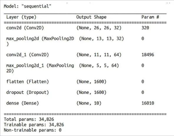 print(model.summary( ))score = model.evaluate(x_test, y_test, verbose=0)print(“Test loss:”, score[0])print(“Test accuracy:”, score[1])