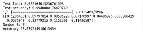 第 22 行打印我们训练的模型的摘要信息(见图 6)。回想一下,在加载数据集时将其分为了训练数据和测试数据。第 23 行使用测试数据来测试我们训练的模型的准确性。第 24 行和第 25 行打印测试的详细信息(见图 8)。