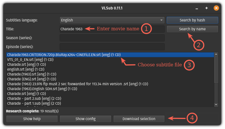 要使用 VLsub 下载字幕,首先,输入电影名称和年份以获得更好的结果,然后点击“按名称搜索”按钮,从结果中选择字幕文件,然后单击“下载选择”按钮,如图所示 :