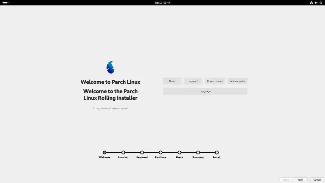我在 虚拟机 上尝试安装了 Parch GNOME 版本,整个过程十分简单明了。点击 “欢迎” 应用程序的一键“安装 Parch”按钮即可启动 Calamares 安装程序。