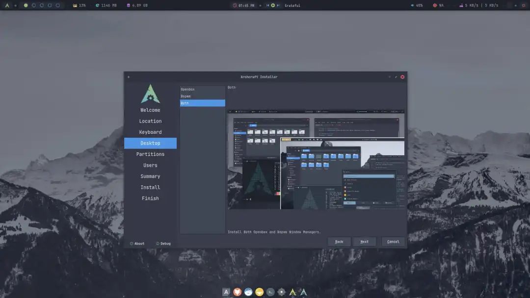 我使用 Calamares 进行安装,在安装过程中,我看到了一个菜单,让我选择窗口管理器。我选择了 “Both”,这样就安装了 Openbox 和 bspwm。