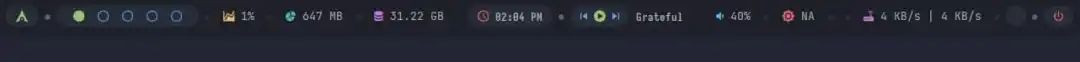 状态栏也有一些非常简洁的选项;从左到右,你将找到带有 Archcraft 徽标的 应用启动器、工作区切换器、一些系统使用信息、时间/日期、音乐播放器控件、音量滑块、网络使用信息和电源按钮。