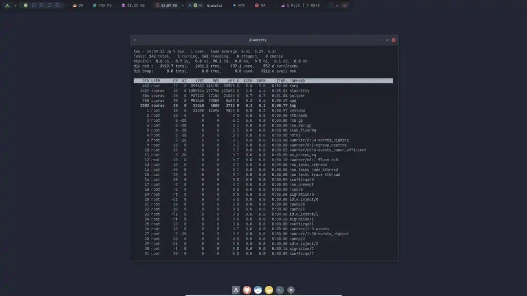 当我单击系统使用信息时,我看到了 Alacritty,它是 Linux 顶级终端模拟器 之一,它向我显示了所有活动进程,以及它们正在使用哪些资源。
