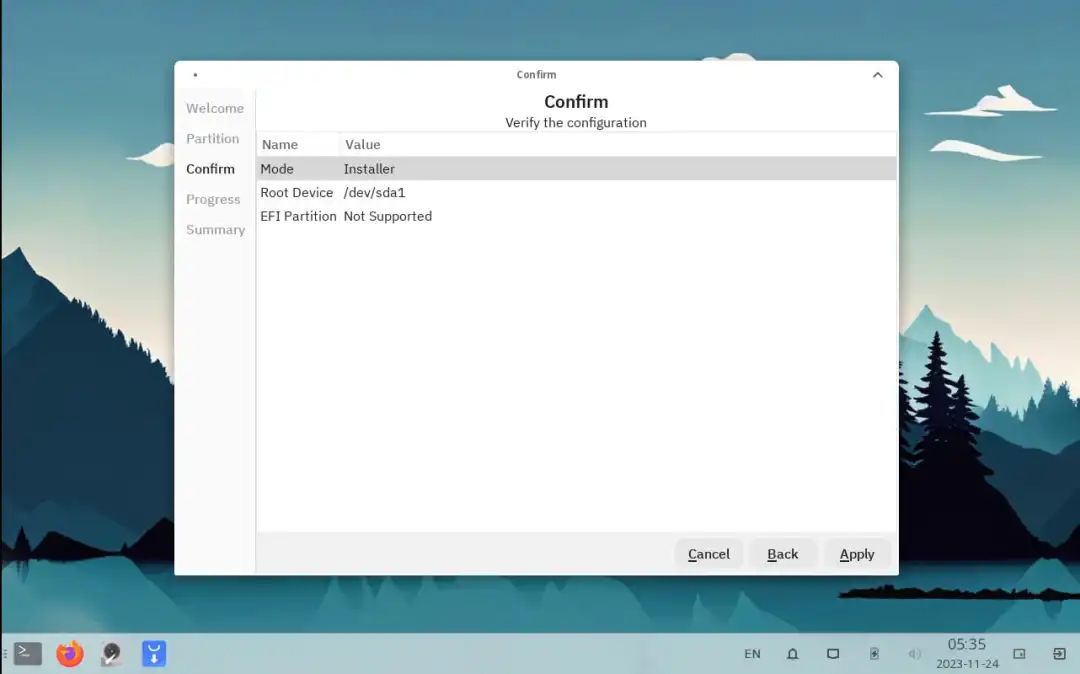 然后,确认屏幕会显示出来,揭示一些重要的最后阶段信息。我点击 “应用” 继续进行。