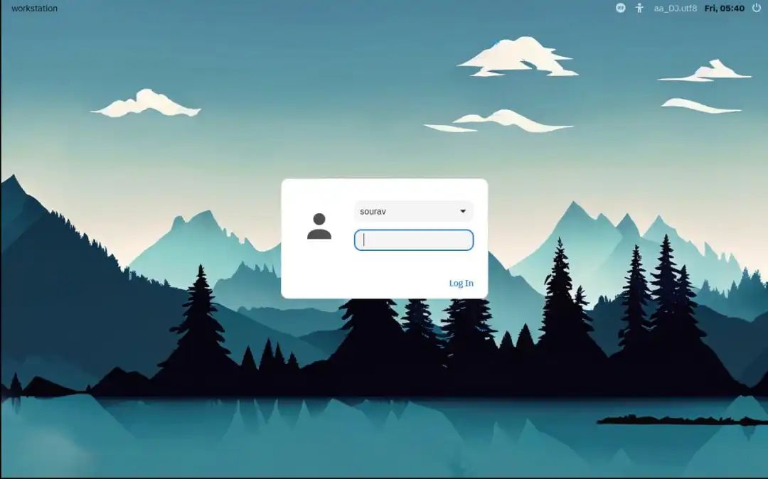 在重启后看到了十分整洁的登录界面,含有一张漂亮的壁纸,和标题栏常见的一些选项/信息。