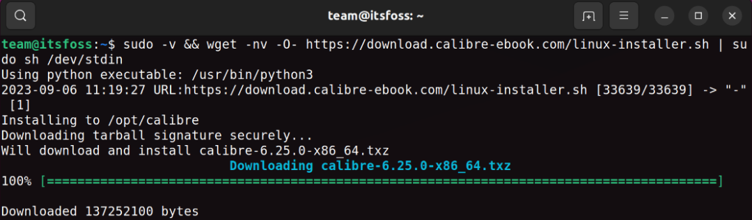 sudo -v && wget -nv -O- https://download.calibre-ebook.com/linux-installer.sh | sudo sh dev/stdin