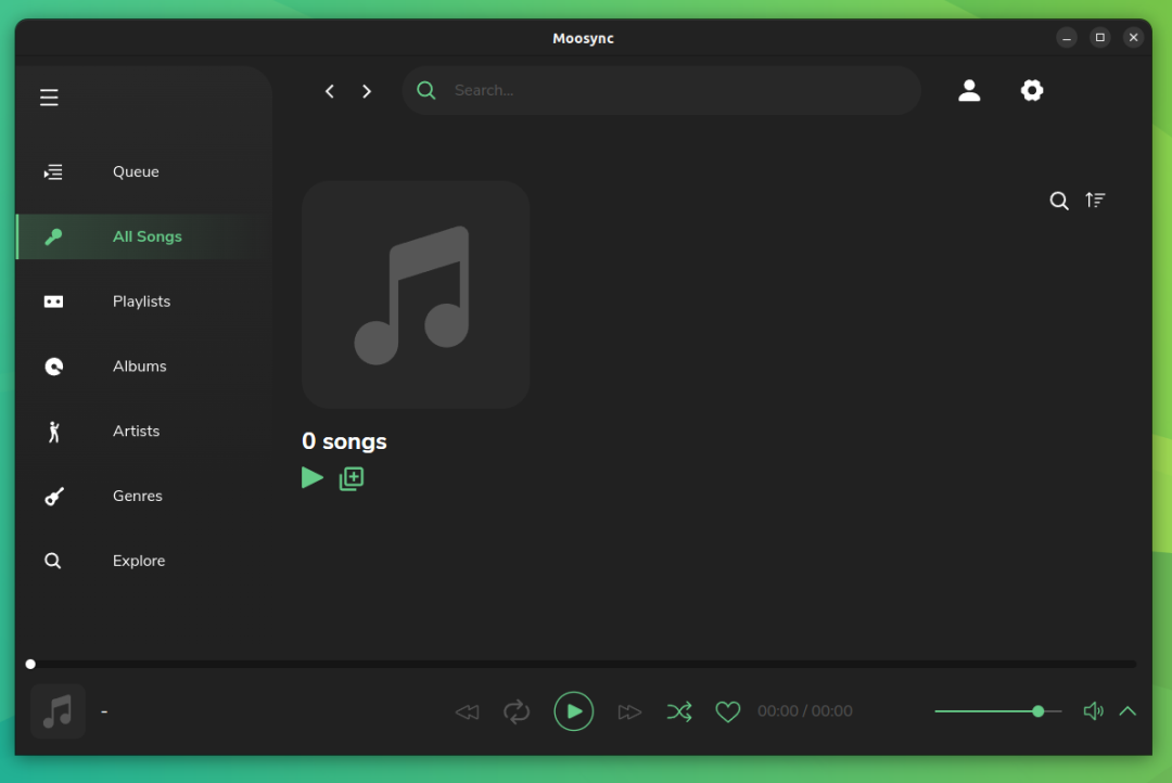 随后,它显示了空白的 “所有歌曲” 标签页,由于目前我未连接任何服务或者本地文件,所以这里是空的。