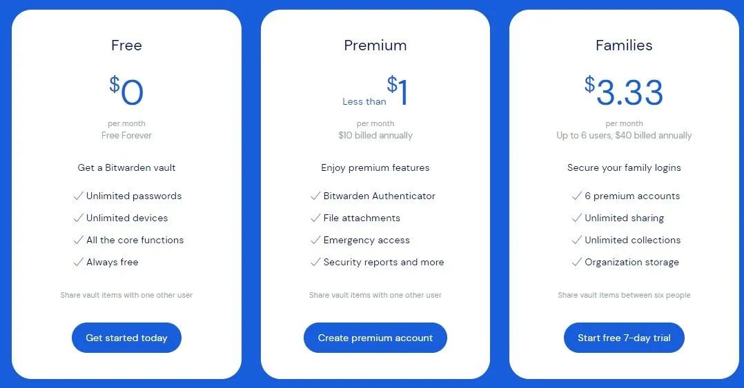 Bitwarden 的年费仅为 10 美元,而其家庭计划(包含六个账户)的年费为 40 美元。这个价格对大多数人来说是极其实惠的。