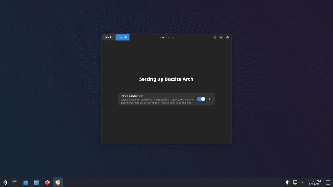 首先,它设置了 Bazzite Arch,它是一个自定义的 Arch Linux OCI,运行在 Distrobox 中,支持 Steam、Lutris 等在其内运行游戏。