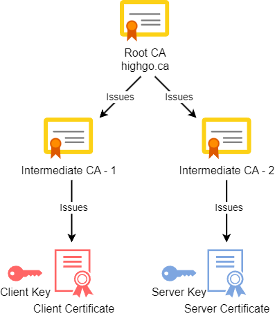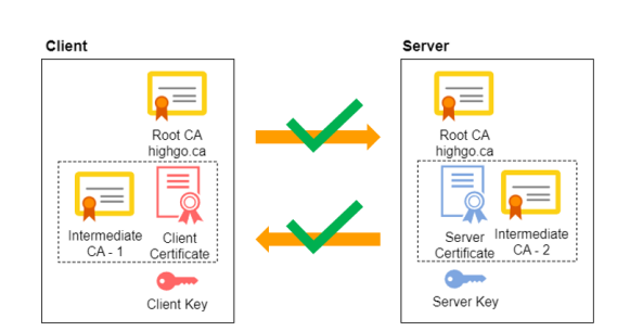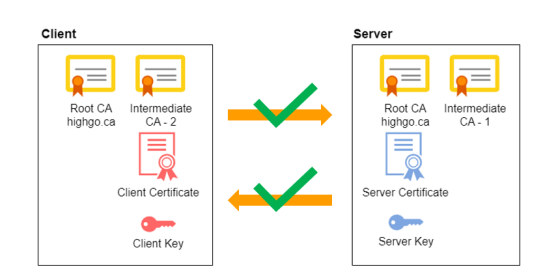 请考虑此证书设置,其中客户端和服务器证书由中间 CA-1 和 CA-2 签名,两者都由公共根 CA 颁发。
