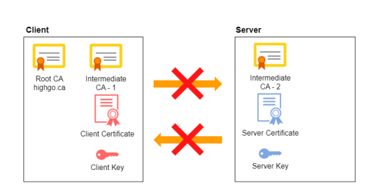 如果 PostgreSQL 客户端和服务器具有以下证书配置,则它们不会相互信任,因为任何一端都无法建立到公共根 CA 的可信路径。