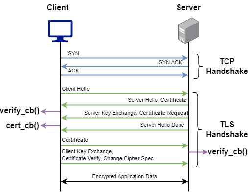 2. 注册一个cert_cb回调函数,当客户端从服务器接收到“证书请求”时,OpenSSL将在握手期间调用该函数。这使我们有机会执行一些逻辑并设置要发送到服务器的所需证书。下面演示了何时调用cert_cb。并调用Verfiy_cb以使我们有机会检查对等证书。我们不会修改这个。