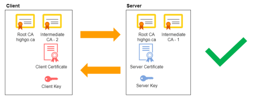 为了确保信任,我们可以将中间 CA 证书附加到同一实体证书文件中(由下面的虚线表示)并发送给另一个对等方。这很重要,因为客户端或服务器可以使用收到的中间 CA 证书来构建公共根 CA 的路径,因此在下面的情况下,客户端和服务器可以相互信任。