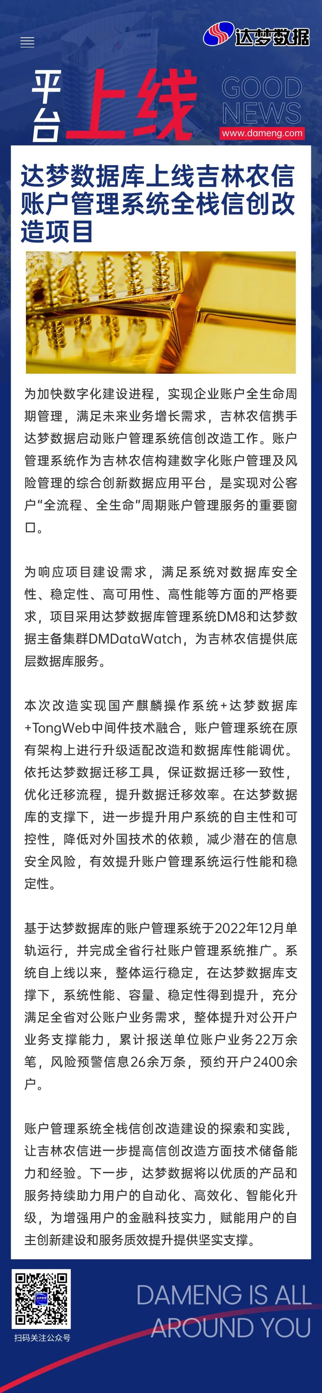 龙年开门红丨达梦数据库上线吉林农信账户管理系统全栈信创改造项目