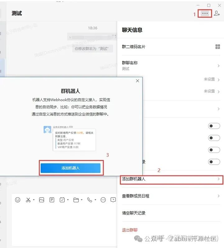 先创建一个群聊,点击菜单->添加群机器人->添加机器人。