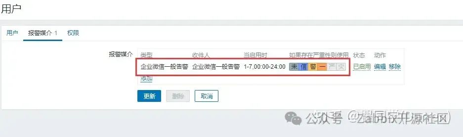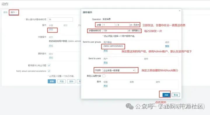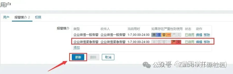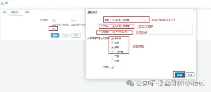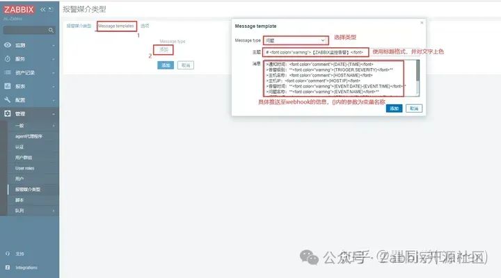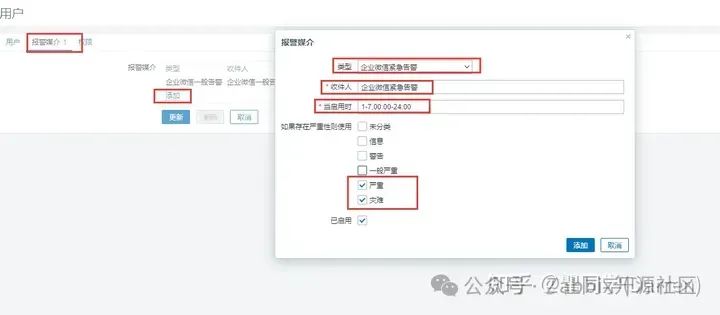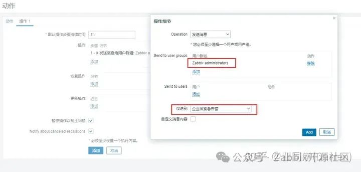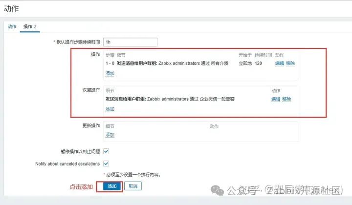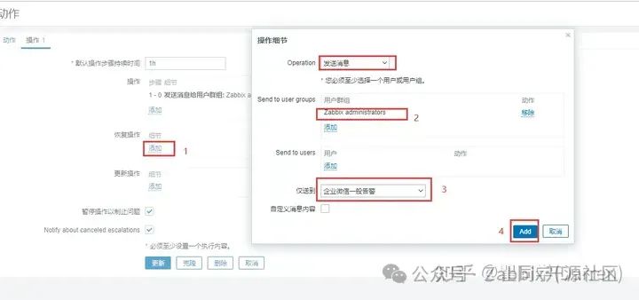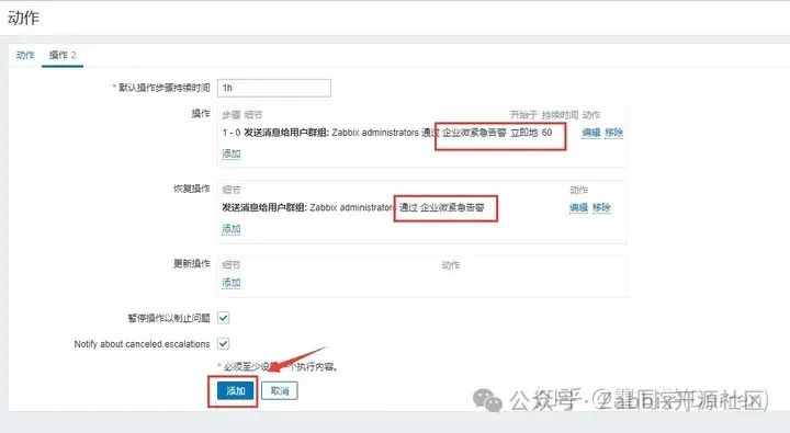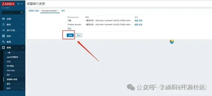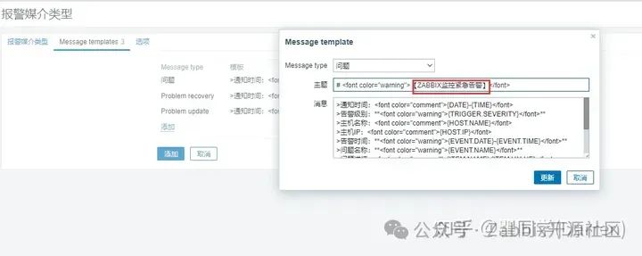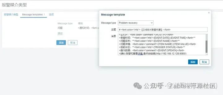 修改告警消息模板,主题修改为ZABBIX监控紧急告警 ,问题和恢复都需要修改然后点击添加。