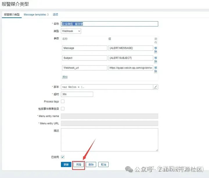 将一般告警媒介克隆一份,替换Webhook的地址。