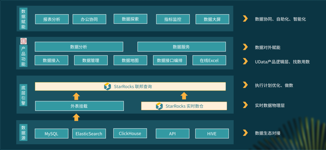 最上层是 Udata 对外赋能提供的能力,包括数据地图、在线分析、数据服务、办公协同等。