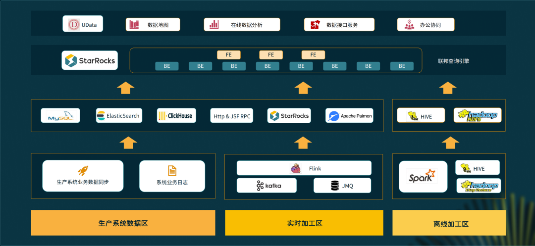 往上一层是 OLAP 层,包含 MySQL、Elasticsearch、ClickHouse 等数据库,另外还有 StarRocks、Paimon。右则是离线区,采用了 Hive 和 HDFS。